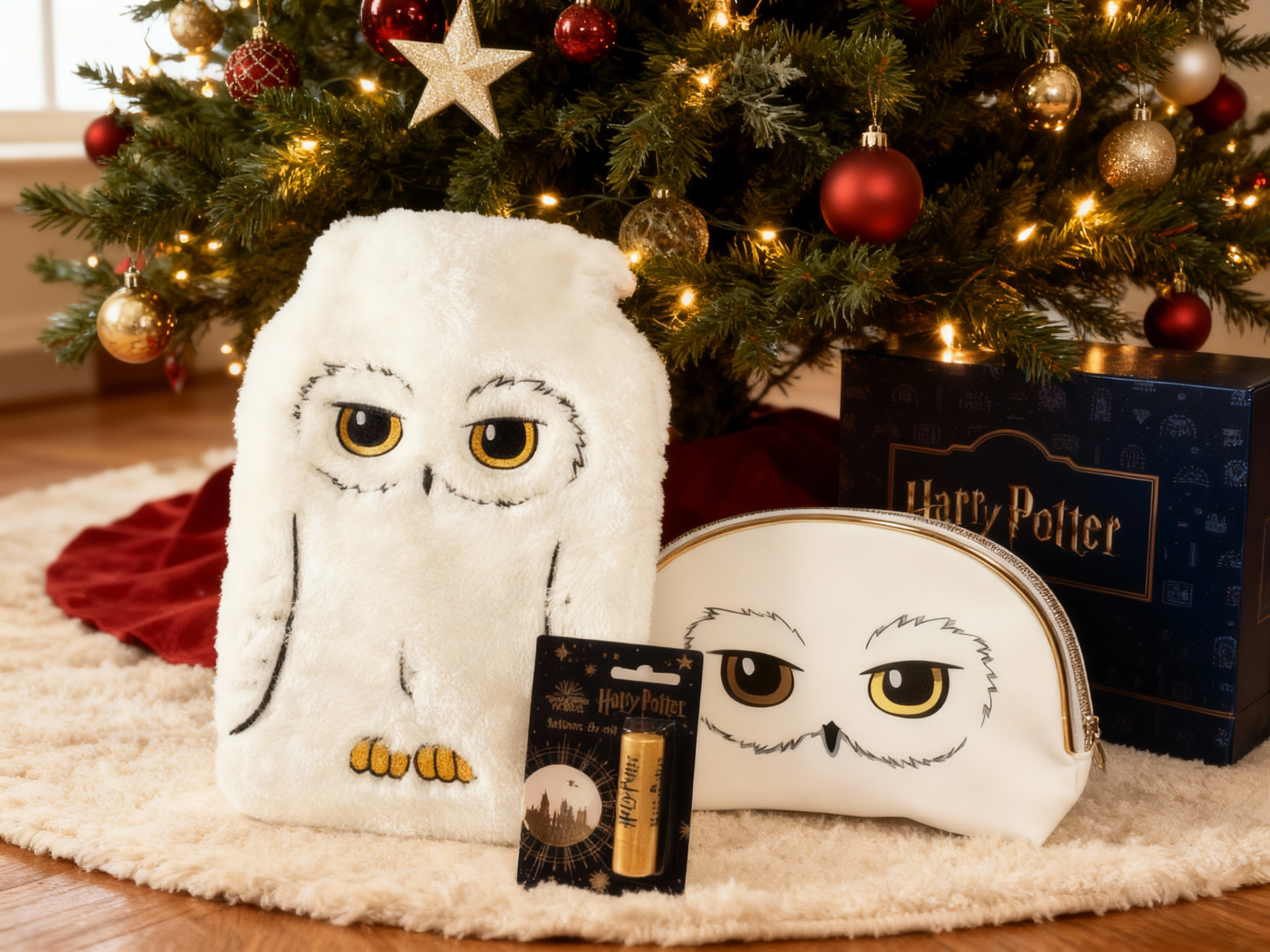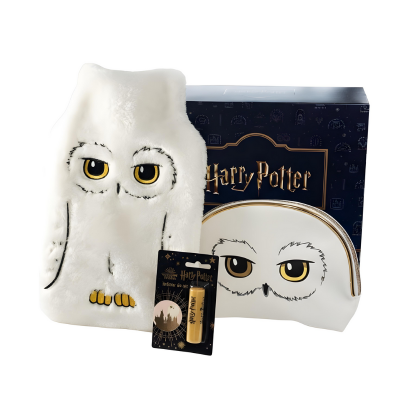 W środku znajdziesz miękki termofor w kształcie sowy Hedwigi, ochronny balsam do ust oraz elegancką kosmetyczkę.
