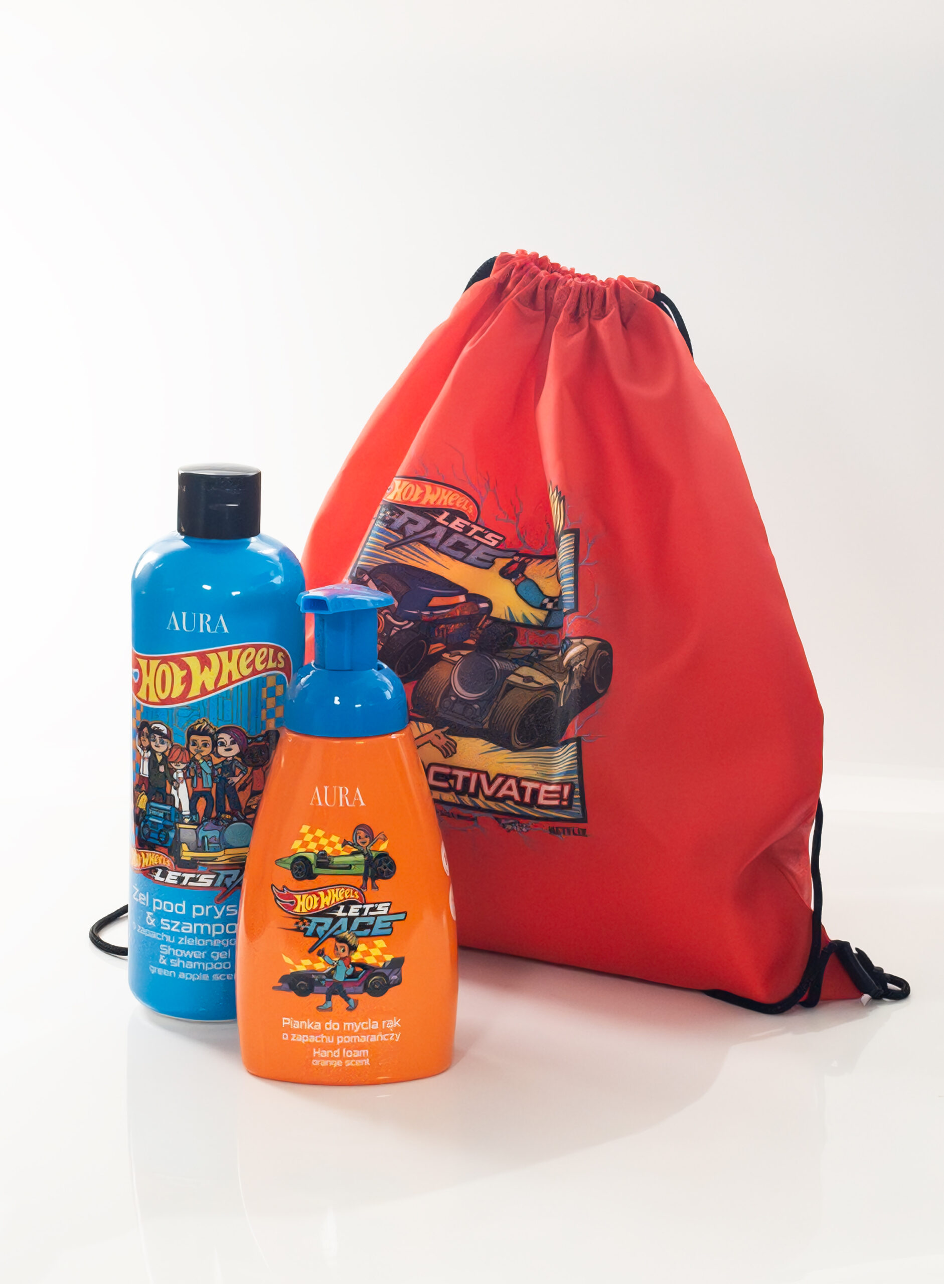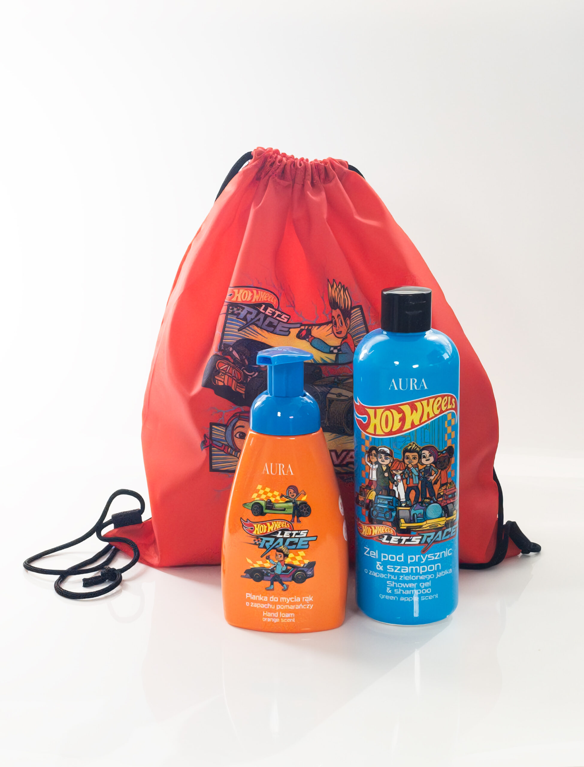 Zestaw prezentowy Hot Wheels™ – czerwony worek, żel pod prysznic 500 ml i pianka do rąk 200 ml. Idealny prezent dla chłopca, fana samochodów i prędkości!