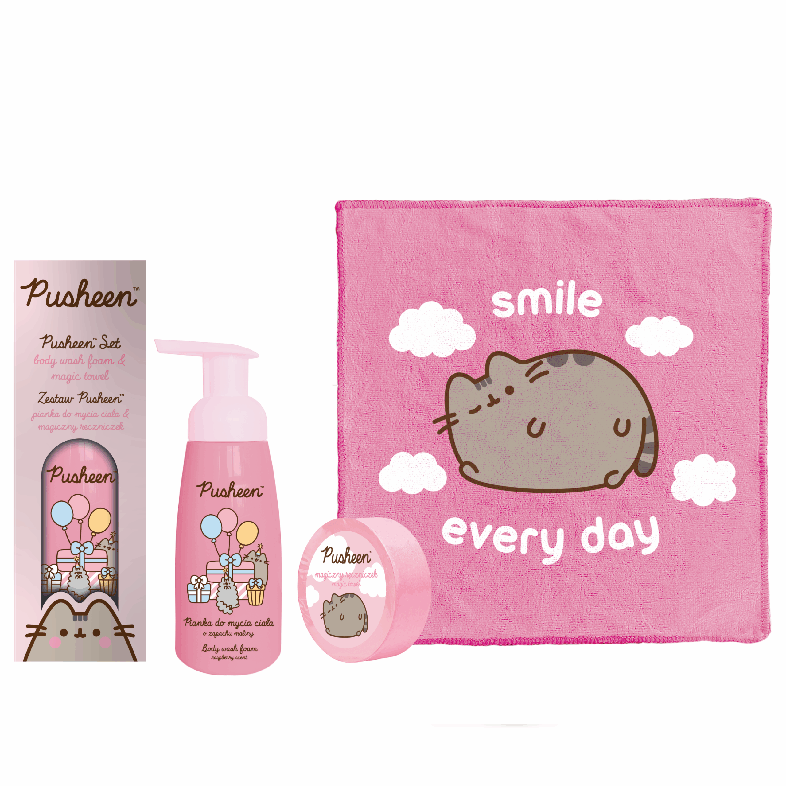 PUSHEEN Zestaw Kosmetyczny Pianka do Mycia Ciała + Ręczniczek „Smile Every Day” – Edycja Świąteczna