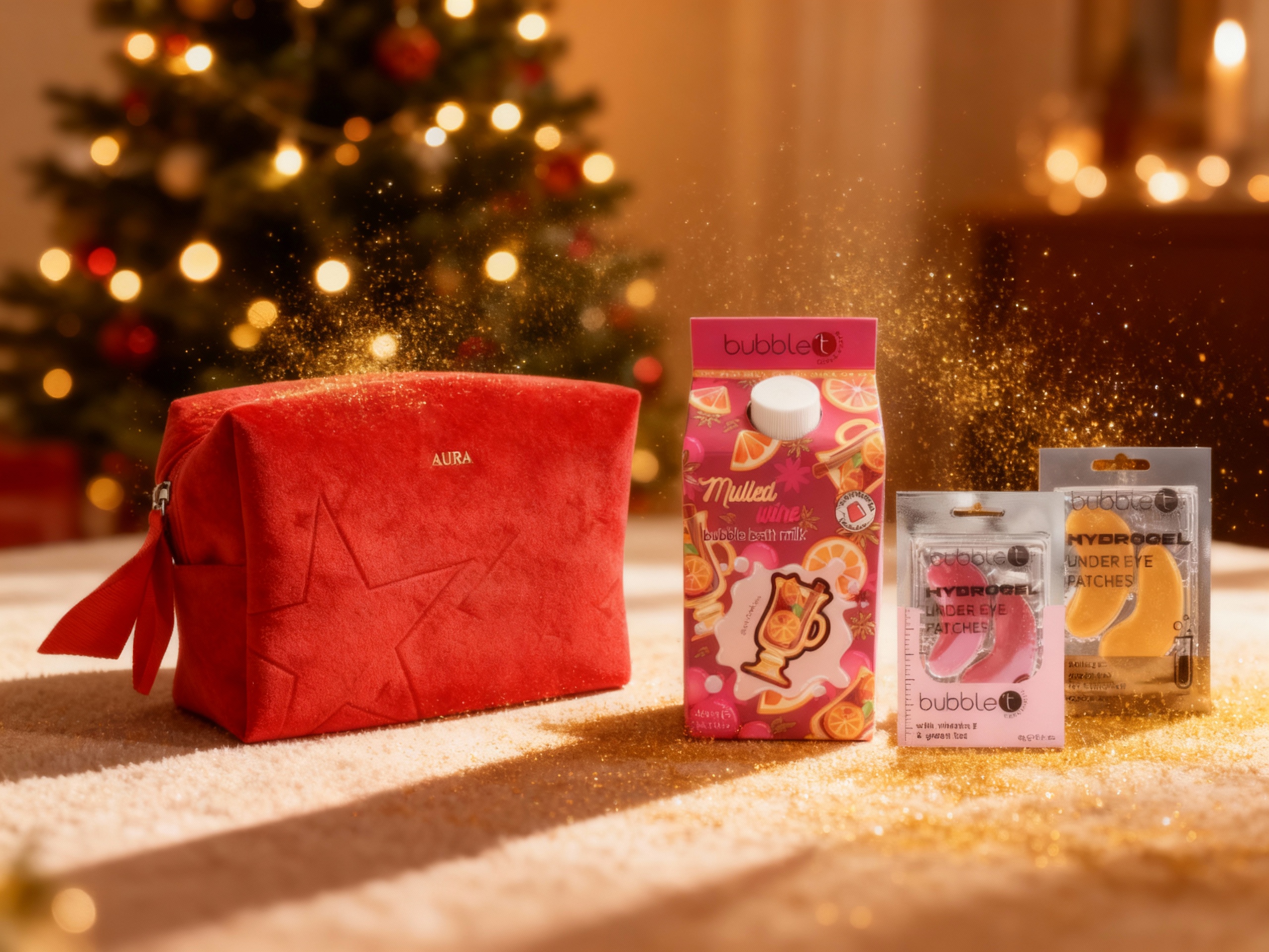 Świąteczny zestaw ALL AURA Bath & Care z czerwoną welurową kosmetyczką: mleczko Bubble T Mulled Wine, złote i różowe płatki pod oczy. Idealny prezent na Święta i Mikołajki.