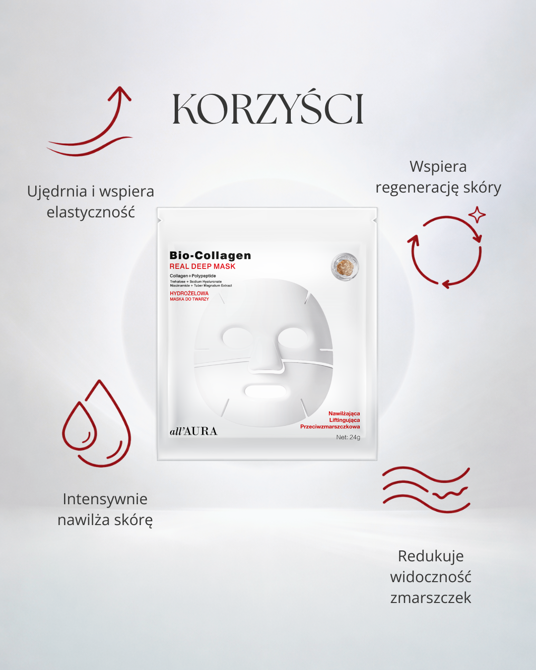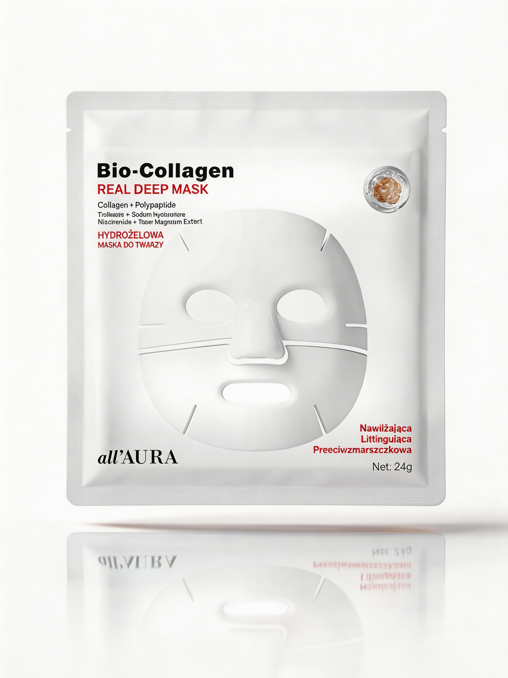 Dzięki połączeniu kolagenu, peptydów i nowoczesnych składników aktywnych, maska stopniowo uwalnia substancje odżywcze, wnikając w głąb skóry. W trakcie działania staje się przezroczysta – to znak, że składniki zostały wchłonięte!