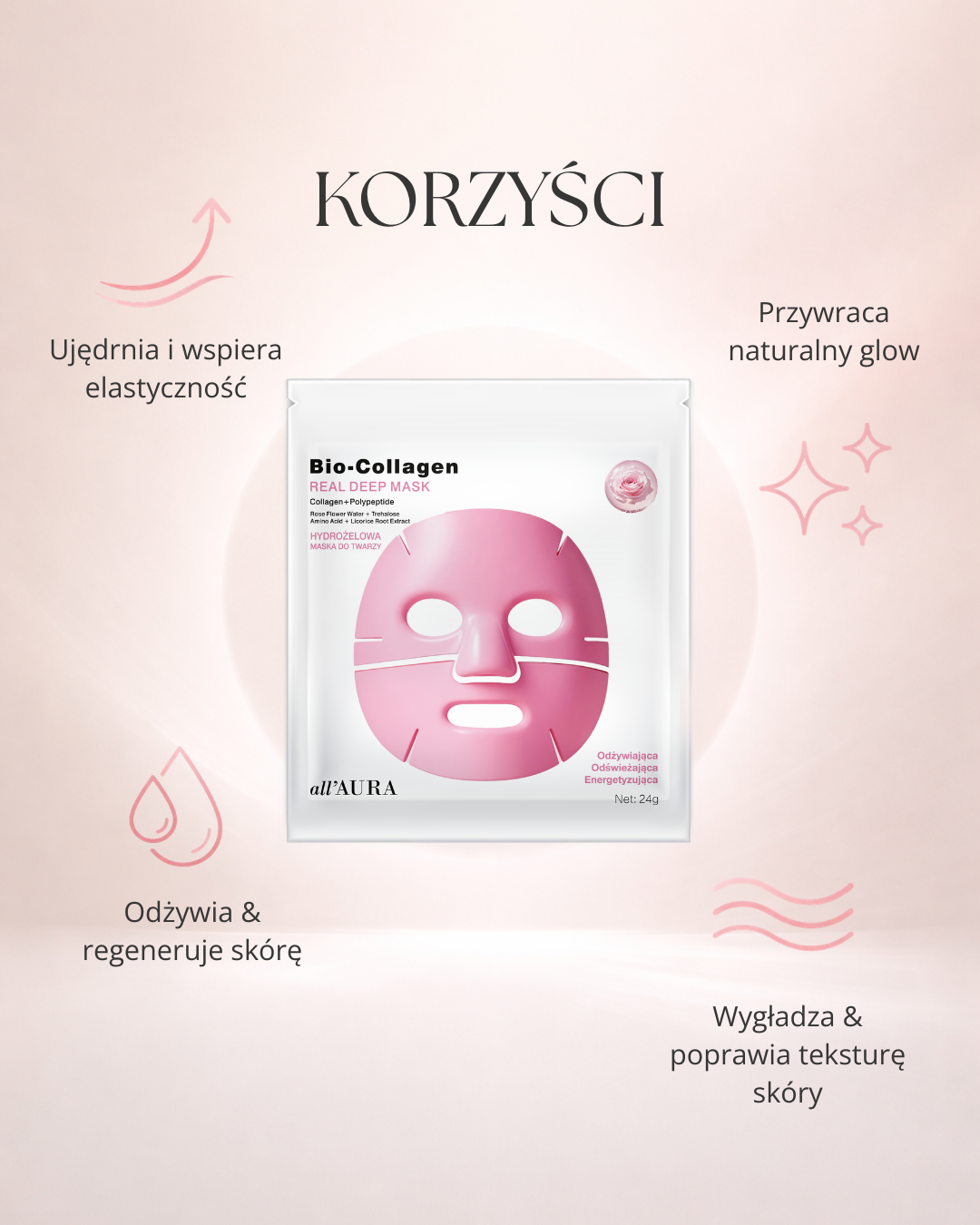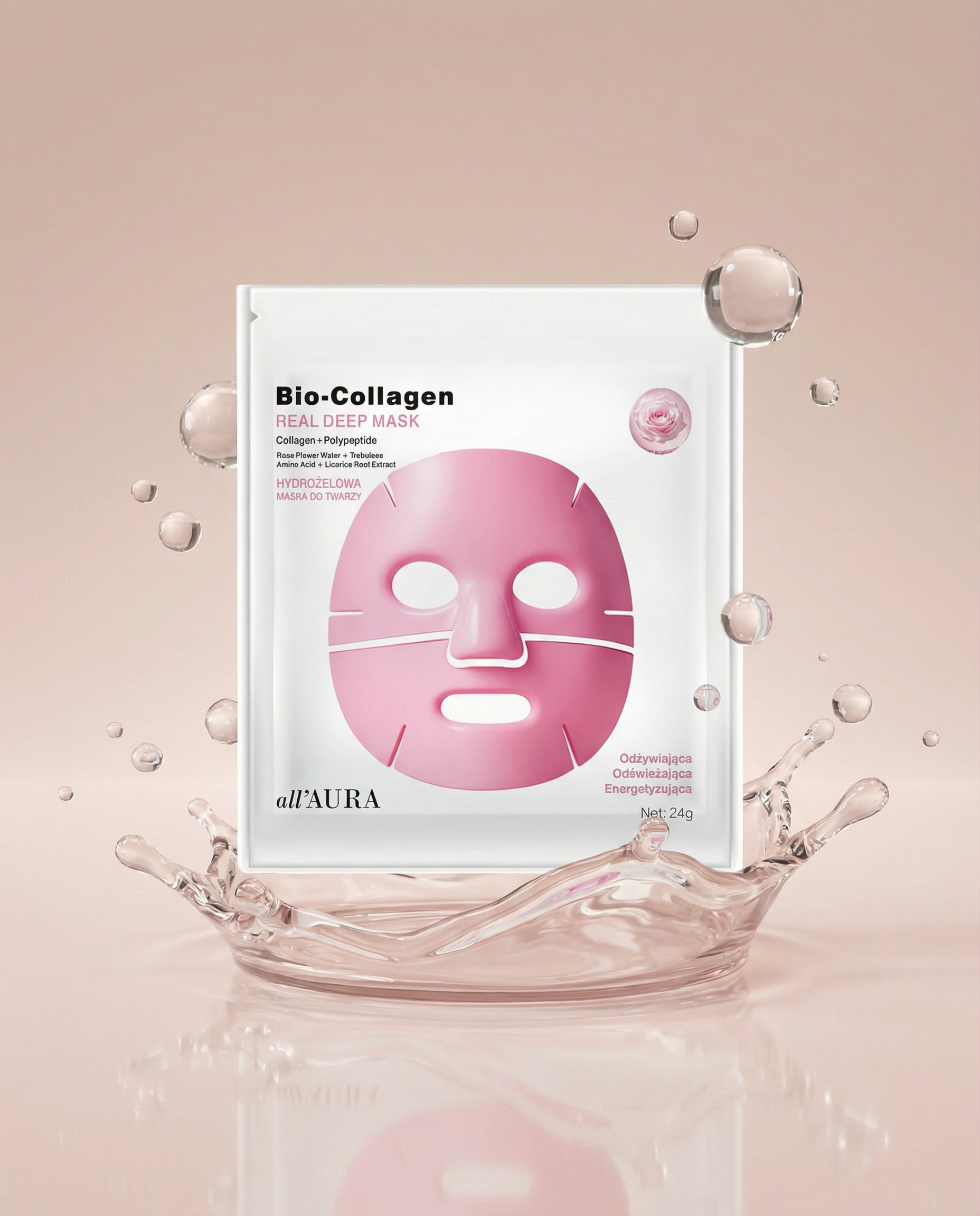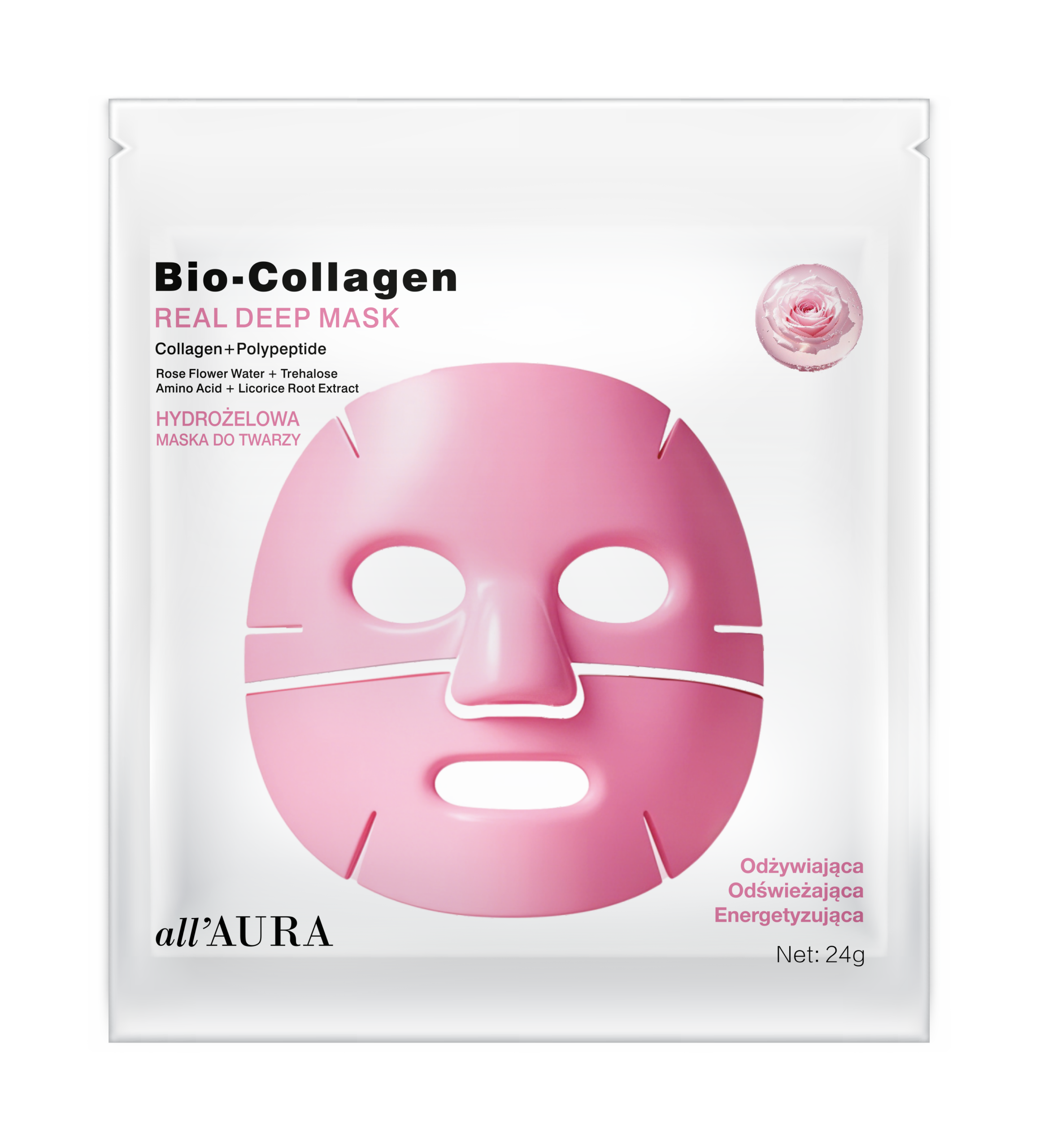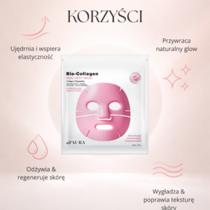Ta innowacyjna hydrożelowa maska łączy moc kolagenu i peptydów z naturalnymi składnikami aktywnymi, takimi jak: