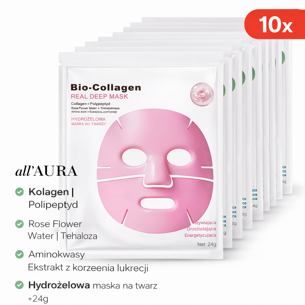 Zestaw 10x Hydrożelowa maska kolagenowa intensywnie nawilża, regeneruje i rozświetla skórę już po jednym użyciu. Efekt promiennej cery!