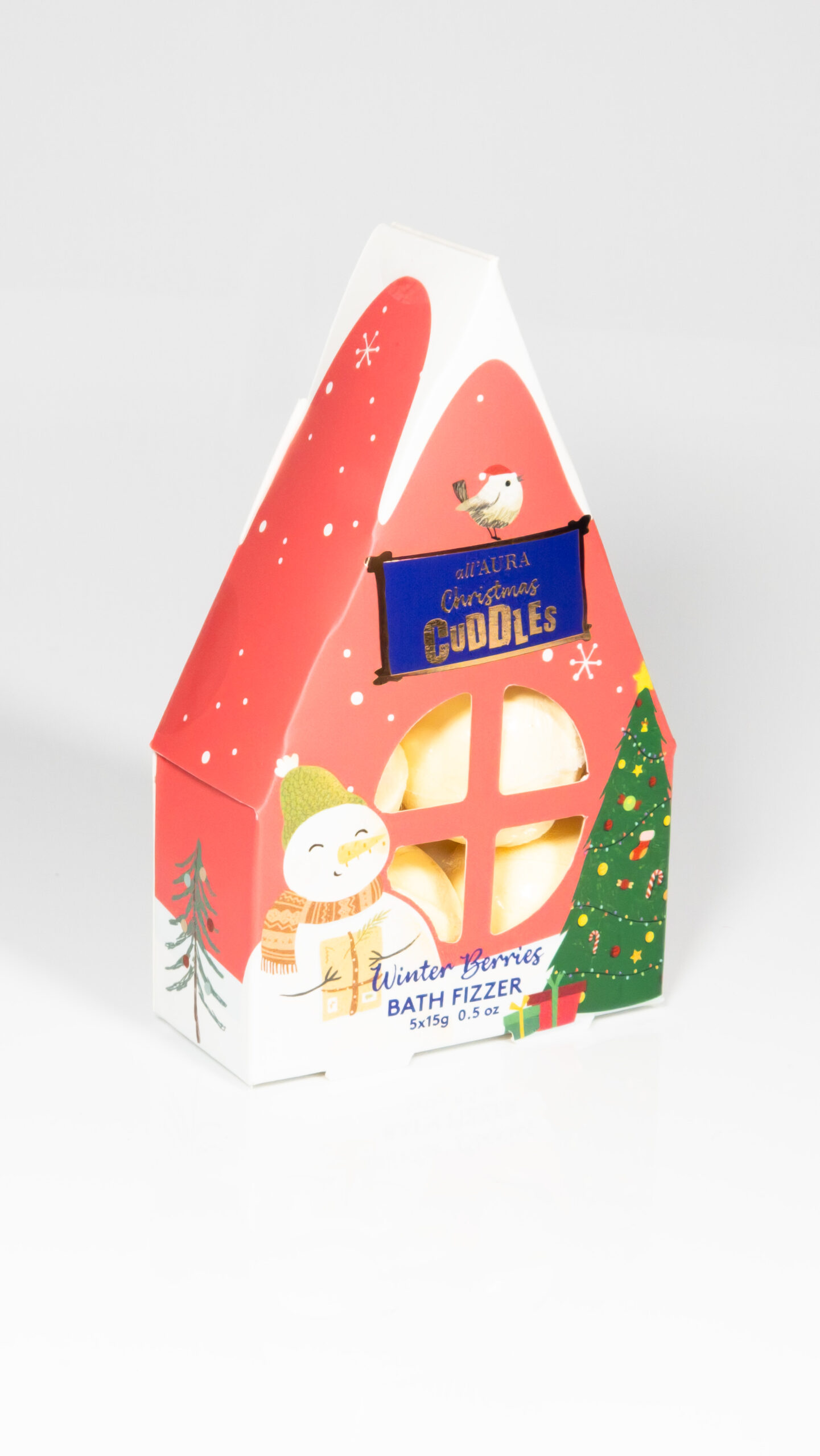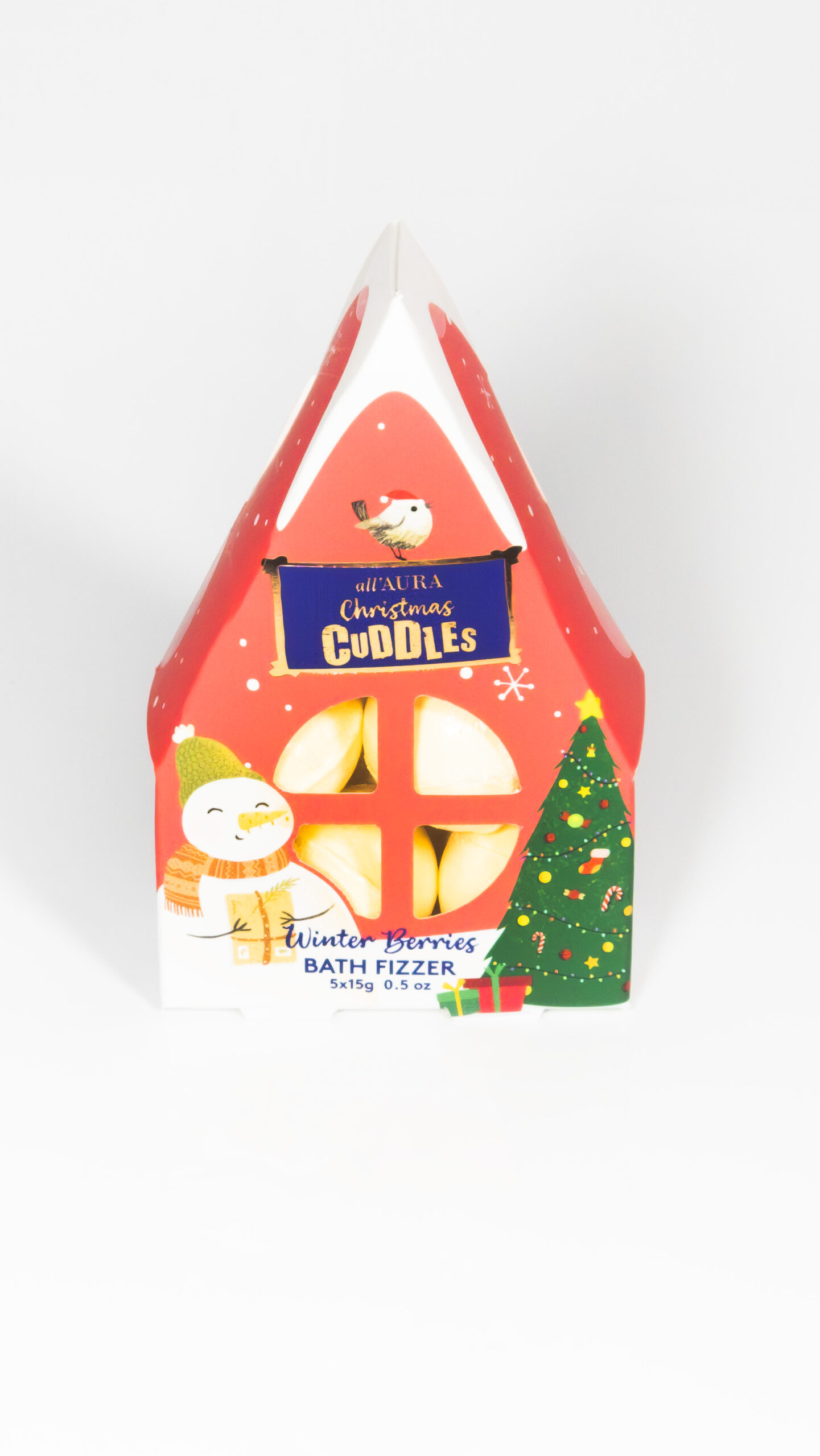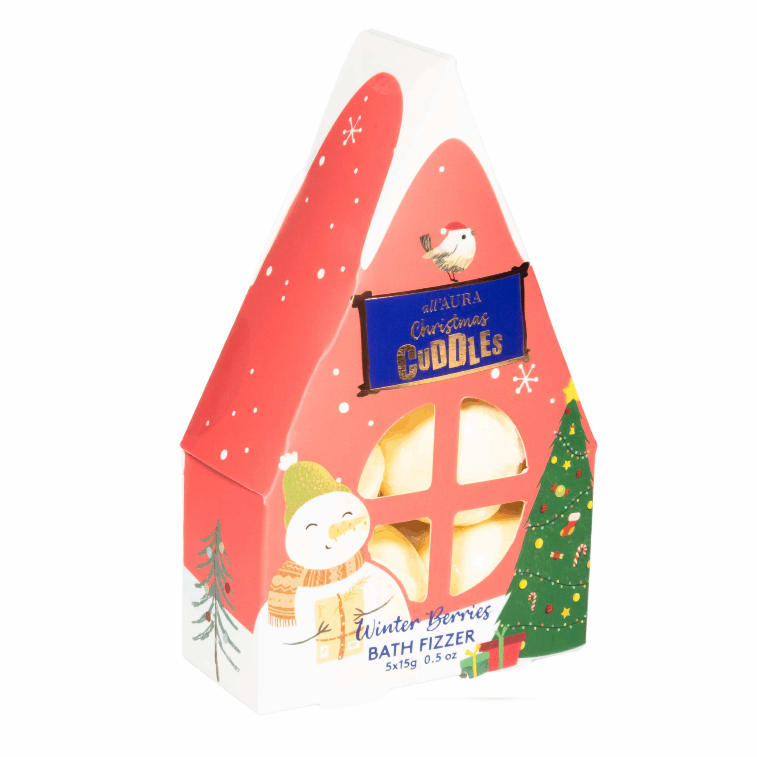 Zestaw do kąpieli AURA X-MASS Domek – 5 musujących kul o zapachu Winter Berries w świątecznym opakowaniu w kształcie domku. Idealny prezent na Boże Narodzenie! 🎁